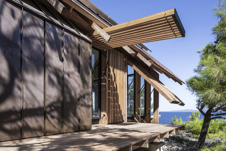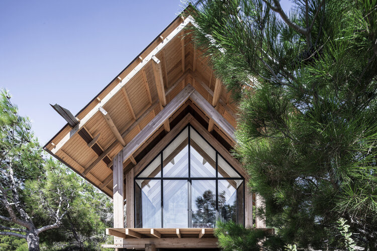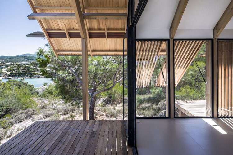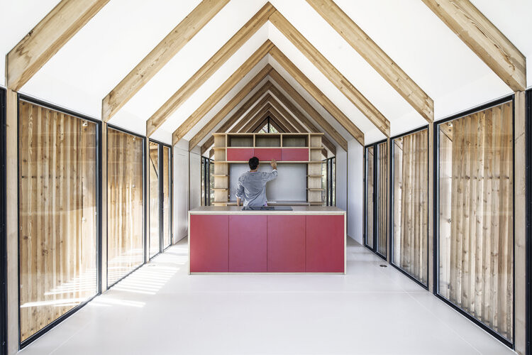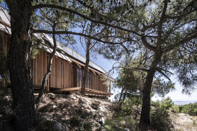 “Um plano simples e aberto permite iluminação natural e facilita a ventilação cruzada. As superfícies transparentes são projetadas para receber o máximo de luz natural nos espaços internos, minimizando a necessidade de iluminação artificial. O telhado de duas águas abriga painéis fotovoltaicos para a produção de eletricidade e painéis solares para o aquecimento de água”